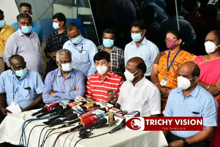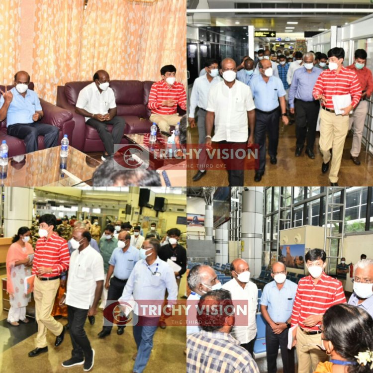 திருச்சி விமானநிலையத்தில், பன்னாட்டு விமானங்களில் இருந்து வருகை தரும் பயணிகளுக்கான ஒமிக்ரான் பரிசோதனை நடவடிக்கைகளை மருத்துவம் மற்றும் மக்கள் நல்வாழ்வுத்துறை அமைச்சர் ம.சுப்பிரமணியன் மற்றும் மக்கள் நல்வாழ்வுத்துறை செயலாளர் ராதாகிருஷ்ணன் ஆகியோர் பார்வையிட்டு ஆய்வு செய்தனர்.