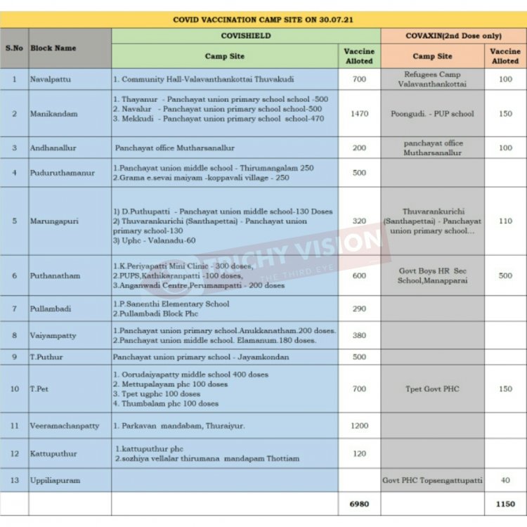 திருச்சி மாவட்டத்தில் நாளை (30.07.2021) கோவிசீல்டு,கோவாக்சின் தடுப்பு ஊசிகள் போடப்படும் என மாவட்ட ஆட்சியர் தெரிவித்துள்ளார்.