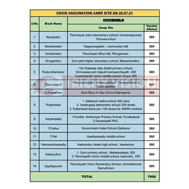 திருச்சி மாவட்டத்தில் 14 ஒன்றியங்களில் நாளை (25.07.2021) கோவிசீல்டு தடுப்பூசி போடப்படும் இடங்கள் மாவட்ட ஆட்சியர் சிவராசு அறிவிப்பு