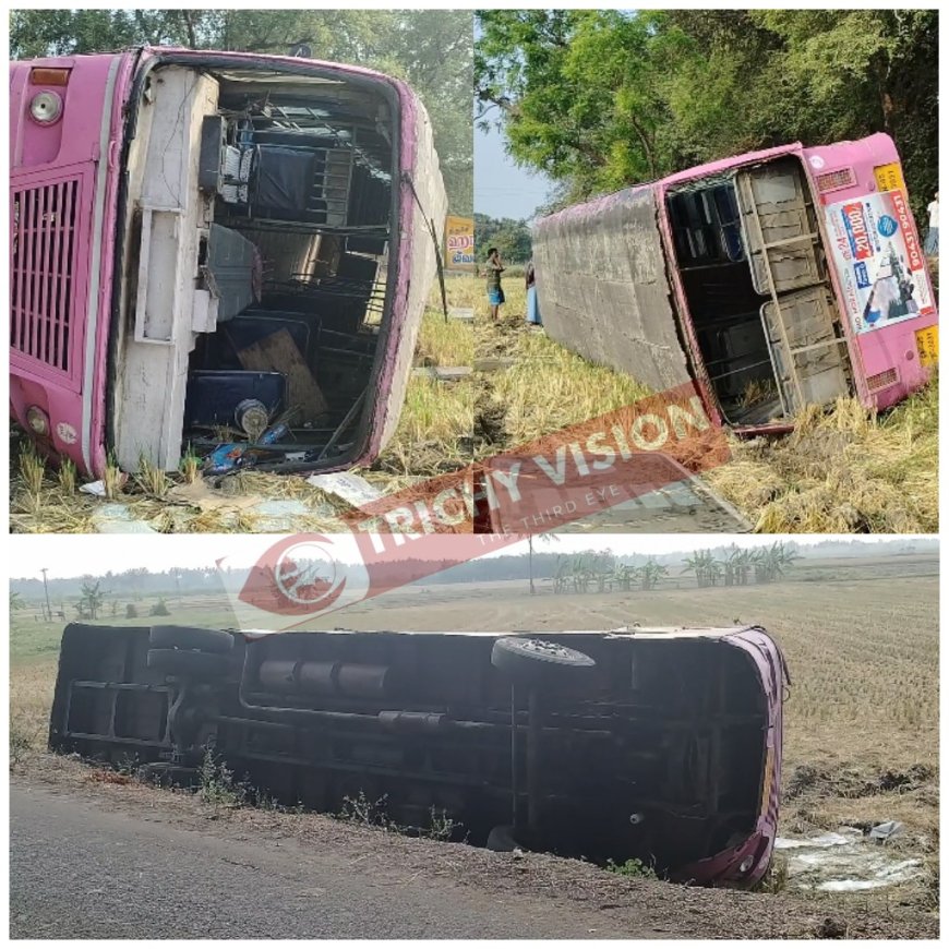 திருச்சி மாவட்டம் லால்குடி அடுத்து நத்தமாங்குடியில் இருந்து சத்திரம் பேருந்து நிலையம் நோக்கி அரசு பேருந்து பள்ளி, கல்லூரி மாணவ மாணவிகள் மற்றும் பயணிகளை ஏற்றிக்கொண்டு இன்று காலை வந்து கொண்டு இருந்தது. அப்போது மேட்டுப்பட்டி அருகே வந்து கொண்டு இருந்த போது டிரைவரின் கட்டுப்பாட்டை இழந்த அரசு பேருந்து வயலில் கவிந்து விபத்துக்குள்ளானது.
