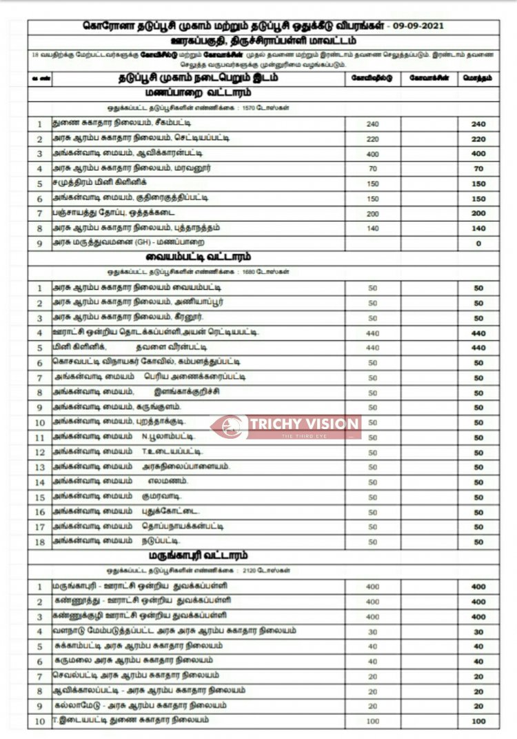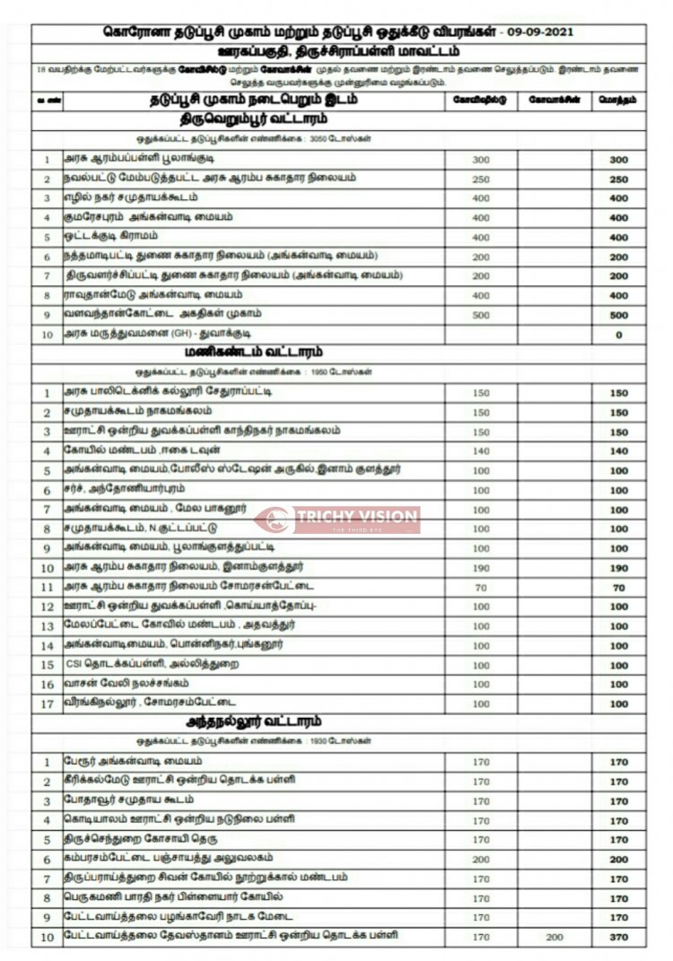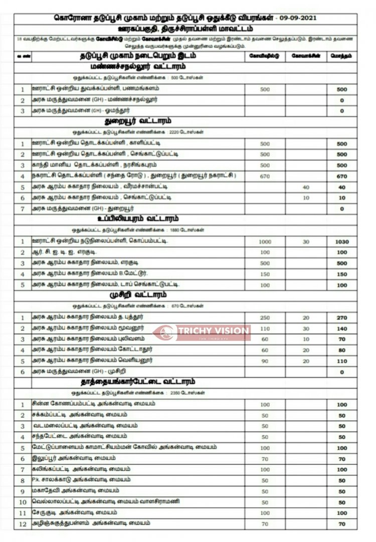திருச்சி மாவட்டத்தில் இன்று (09.09.2021) கோவிசீல்டு, கோவாக்சின் தடுப்பு ஊசிகள் போடப்படும் இடங்களை மாவட்ட நிர்வாகம் அறிவித்துள்ளது.