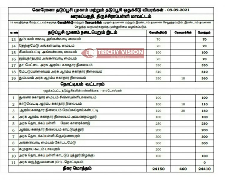 திருச்சி மாவட்டத்தில் இன்று (09.09.2021) கோவிசீல்டு 24150, கோவாக்சின் 460 தடுப்பூசிகள் போடப்படும் என மாவட்ட ஆட்சியர் தெரிவித்துள்ளார்.