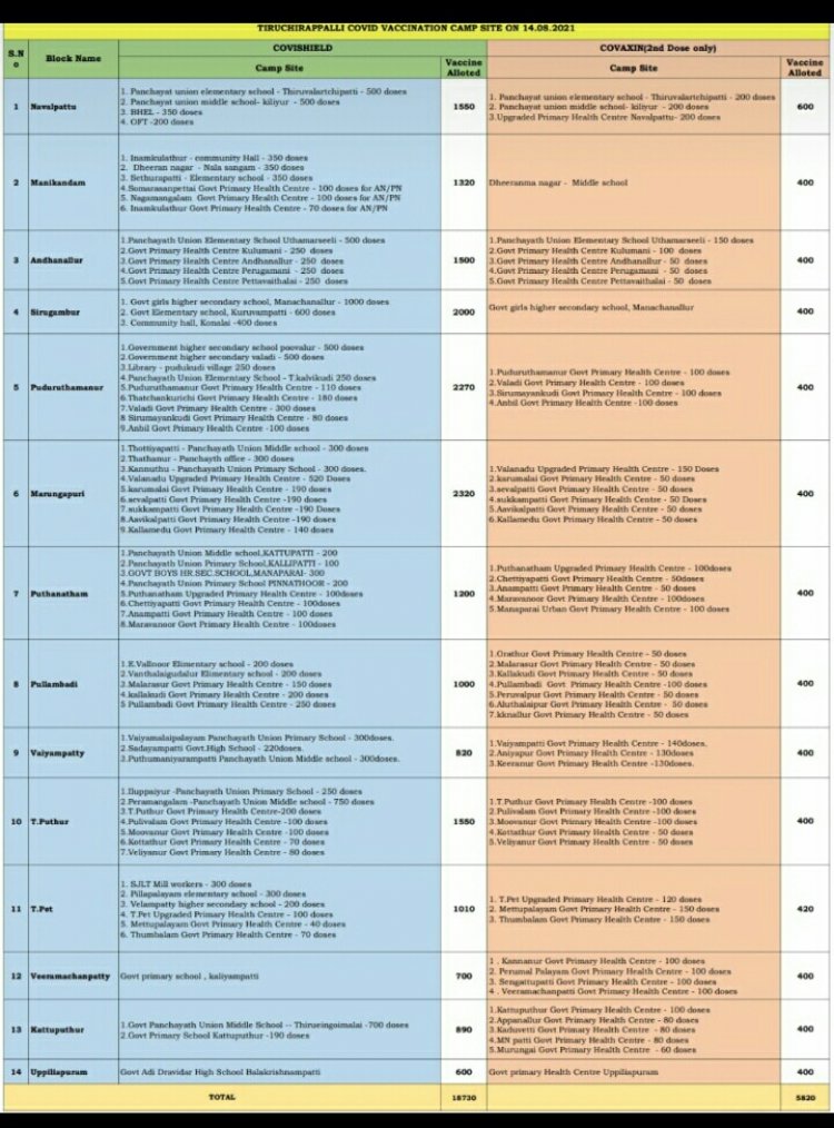 திருச்சி மாவட்டத்தில் 14 ஒன்றியங்களில் இன்று (14.08.2021) கோவிசீல்டு தடுப்பு ஊசிகள் போடப்படும் இடங்களை மாவட்ட நிர்வாகம் அறிவித்துள்ளது.