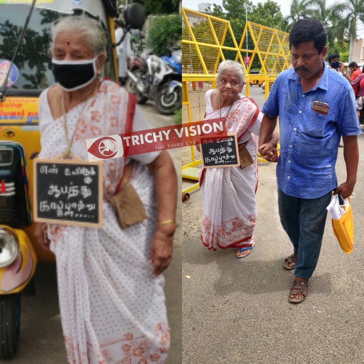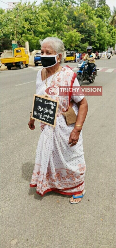 82 வயதில் நடக்க முடியாமல் தள்ளாடி தனது கழுத்தில் சிலேட்டுடன் மாவட்ட ஆட்சியரை சந்தித்து மனு கொடுக்க வந்த போது ஆட்சியர் அலுவலகம் சிறிது நேரம் பரபரப்புடன் காணப்பட்டது.
