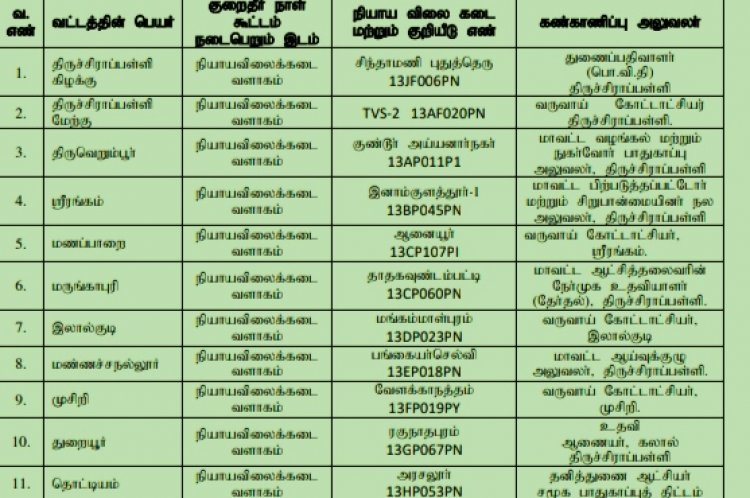 அதன்படி திருச்சி மாவட்டத்தில் (10.12.2022) காலை 10 மணி முதல் பிற்பகல் 1.00மணி வரை கீழ்கண்ட வட்டங்களில் அதன் எதிரே குறிப்பிட்டுள்ள நியாய விலை அங்காடிகளில் பொது விநியோகத் திட்ட குறைதீர்க்கும் நாள் கூட்டம் தனி வட்டாட்சியர்கள், வட்ட வழங்கல்  அலுவலர்களால் நடத்தப்பட உள்ளது.