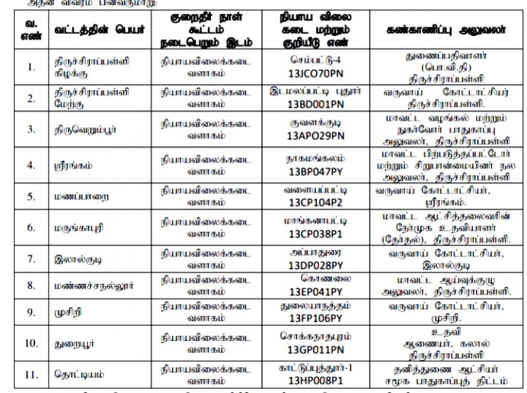 அதன்படி திருச்சி மாவட்டத்தில் நாளை (08.10.2022) காலை 10 மணி முதல் பிற்பகல் 1.00மணி வரை கீழ்கண்ட வட்டங்களில் அதன் எதிரே குறிப்பிட்டுள்ள நியாய விலை அங்காடிகளில் பொது விநியோகத் திட்ட குறைதீர்க்கும் நாள் கூட்டம் தனி வட்டாட்சியர்கள், வட்ட வழங்கல்  அலுவலர்களால் நடத்தப்பட உள்ளது.