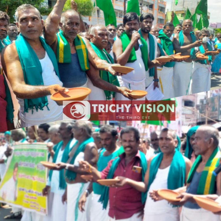 திருச்சி அண்ணா சிலை அருகில் ஆர்ப்பாட்டம் நடத்தினர். இச்சங்கத்தின் மாநில தலைவர் விஸ்வநாதன் தலைமையில் நடைபெற்ற ஆர்ப்பாட்டத்தில் கலந்து கொண்ட விவசாயிகள் அரை நிர்வானத்தோடு திருவோடு ஏந்திநூதன முறையில் ஆர்ப்பாட்டம் நடத்தினர்.