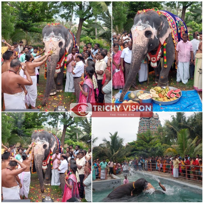 2002-ம் ஆண்டு பிறந்த அகிலா யானையானது கடந்த 2011ம் ஆண்டு முன்னாள் முதலமைச்சர் ஜெயலலிதா ஆட்சியின்போது திருக்கோவில் பூஜைகள் மற்றும் திருப்பணிக்காக திருவாணைக்காவல் கோவிலுக்கு கொண்டு வரப்பட்டது. அகிலாவிற்கு இன்று 22-வது வயதை எட்டும் நிலையில் திருக்கோவில் சார்பில் யானைக்கு பிறந்த நாள் விழா கொண்டாடப்பட்டது. கோவில் யானை அகிலா அலங்கரிக்கப்பட்டு அழைத்து வரப்பட்டது.