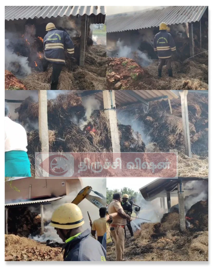 இந்த நிலையில் திடீரென வைக்கோல் தீ பற்றி எரியத் தொடங்கியது. உடனடியாக. அருகில் இருந்தவர்கள் துவரங்குறிச்சி தீயணைப்பு துறையினருக்கு தகவல் அளித்தனர். தகவலை தொடர்ந்து மனோகர் தலைமையிலான தீயணைப்பு வீரர்கள் சம்பவ இடத்திற்கு விரைந்து சென்று தண்ணீரை பீய்ச்சி அடித்து தீயை அணைக்கும் பணியில் ஈடுபட்டு வருகின்றனர்.