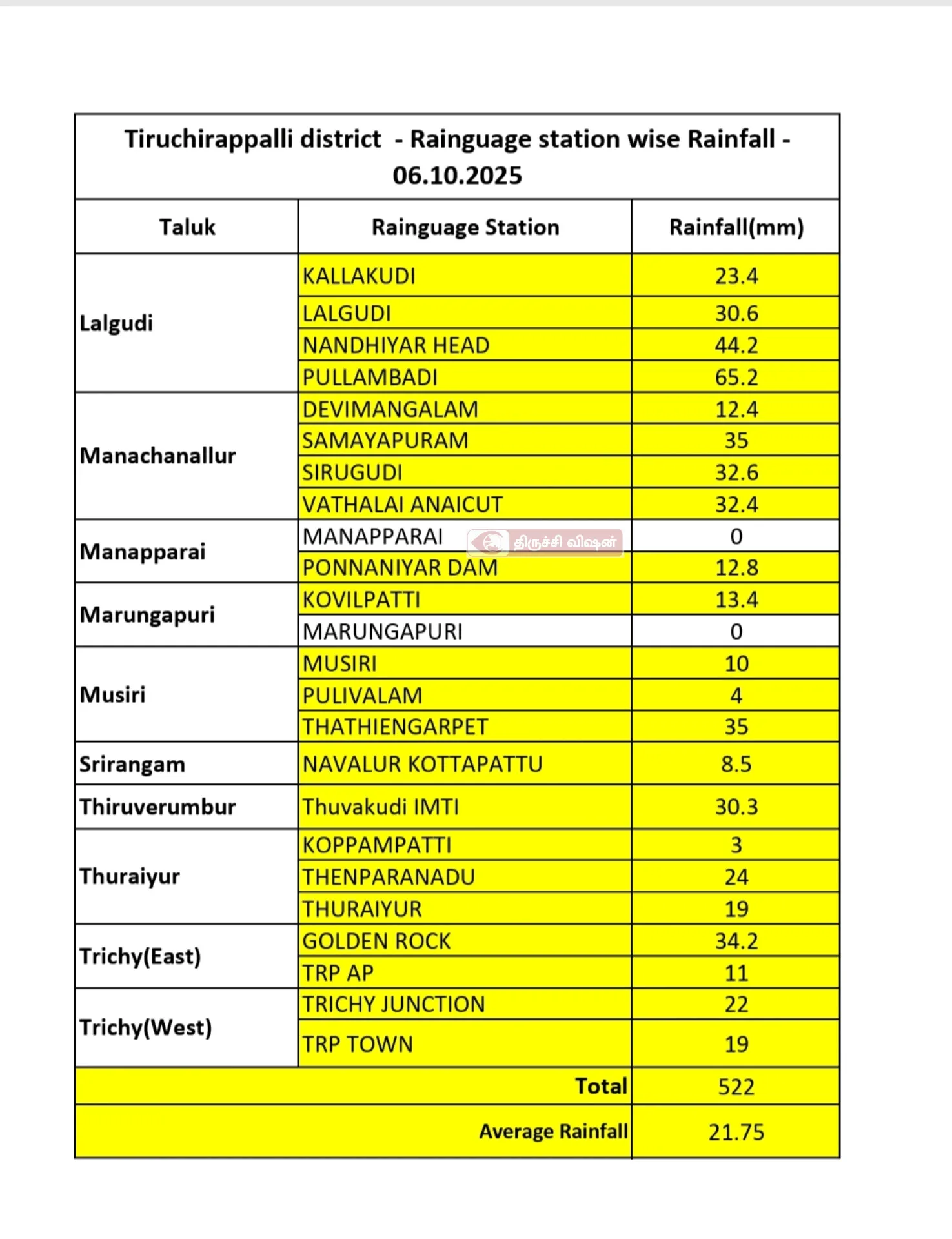 இன்று (06.10.2025) காலை நிலவரப்படி திருச்சி மாவட்டத்தில் 522 மிமீ மழை பதிவானது.