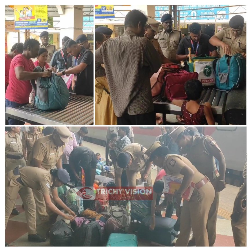அந்த வகையில் திருச்சி ஜங்ஷன் ரயில் நிலையத்தில் 20 க்கும் மேற்பட்ட ரயில்வே பாதுகாப்பு போலீசார் மெட்டல் டிடெக்டர் உதவியுடன் சோதனை மேற்கொண்டனர். பயணிகள் உடைமை, பார்சல்கள், ரயில் பெட்டிகளில் சோதனை மேற்கொள்ளப்பட்டது.