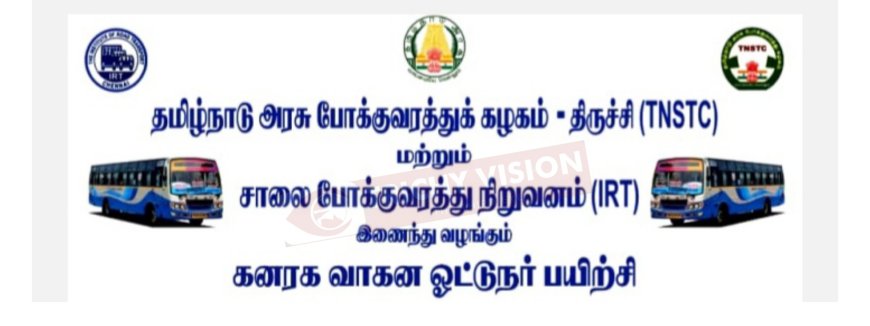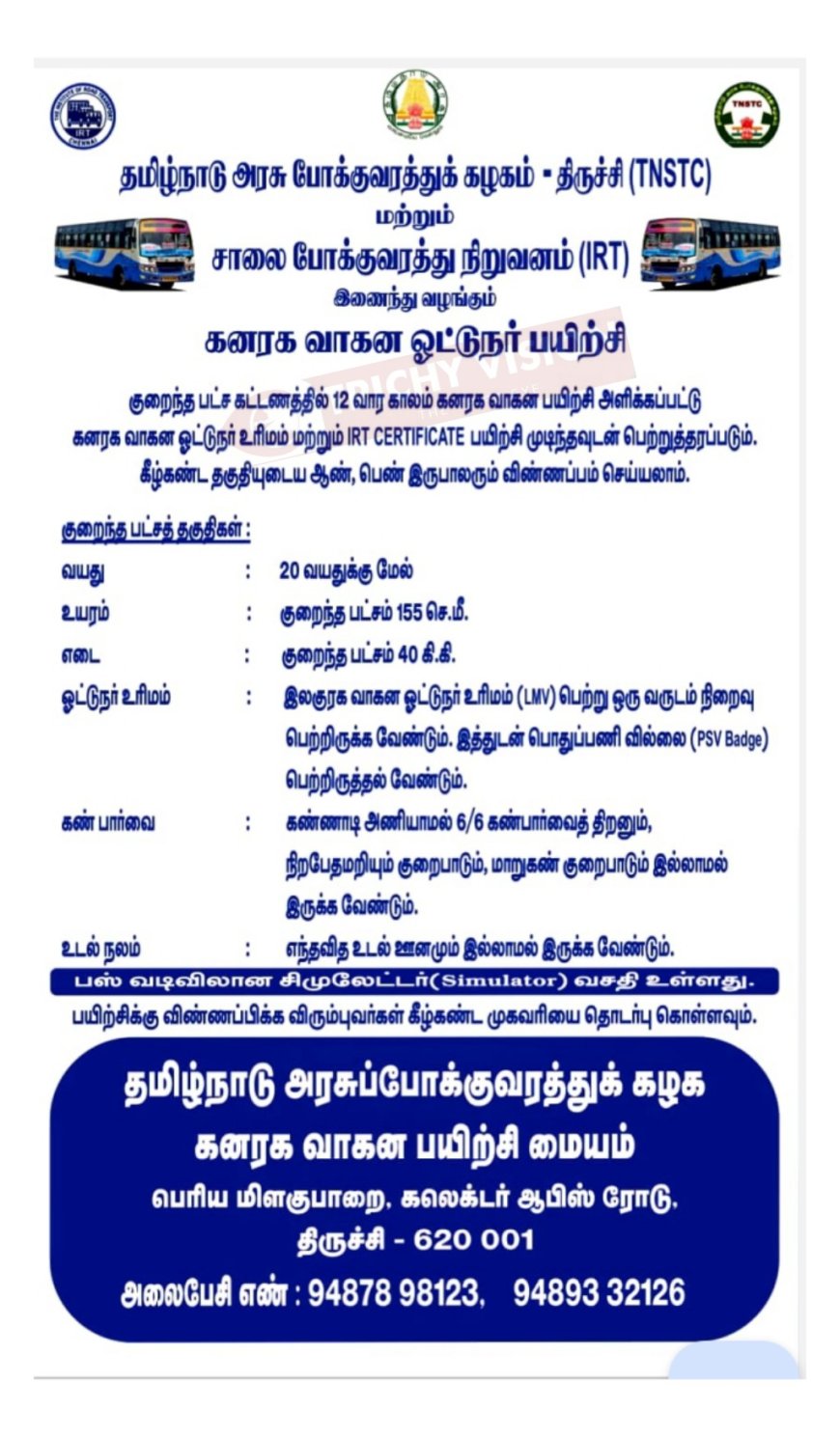 தமிழ்நாடு அரசு போக்குவரத்துக் கழகம் – திருச்சி (TNSTC) மற்றும் சாலை போக்குவரத்து நிறுவனம் (IRT) இணைந்து வழங்கும் கனரக வாகன ஓட்டுநர் பயிற்சி குறைந்த பட்ச கட்டணத்தில் 12 வார காலம் கனரக வாகன பயிற்சி அளிக்கப்பட்டு கனரக வாகன ஓட்டுநர் உரிமம் மற்றும் IRT CERTIFICATE பயிற்சி முடிந்தவுடன் பெற்றுத்தரப்படும். கீழ்கண்ட தகுதியுடைய ஆண், பெண் இருபாலரும் விண்ணப்பம் செய்யலாம்.