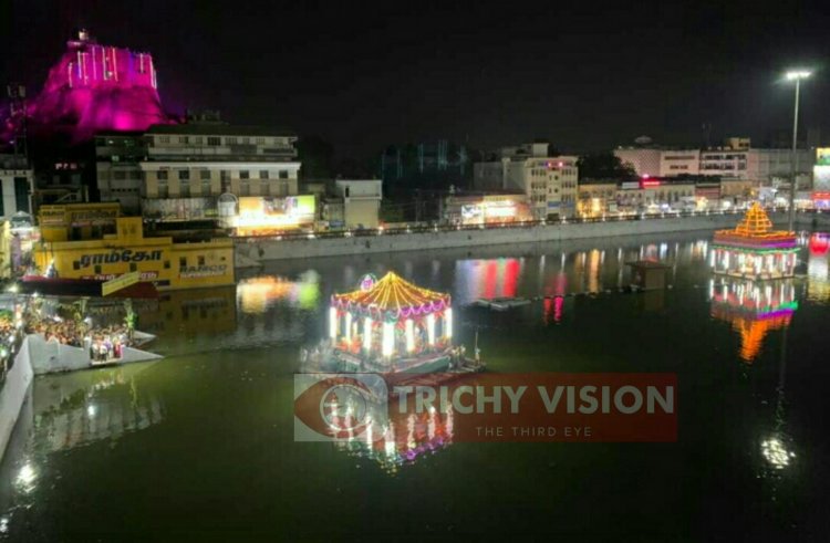 முன்னதாக தாயுமானசுவாமி (சிவபெருமான்) உடனுறை மட்டுவார் குழலம்மை மற்றும் அம்பாளுடன் வாகன மண்டபத்திலிருந்து புறப்பட்டு உள்வீதி, சின்னக்கடைவீதி, என்.எஸ்.பி ரோடு வழியாக வீதி உலா வந்து தெப்ப தீர்த்தக் குளத்தை வந்தடைந்து. அங்கு வண்ணமயமாக மின்விளக்குகளால் அலங்கரிக்கப்பட்டிருந்த தெப்பத்தில் விநாயகர் மற்றும் முருகன் வள்ளி தெய்வாணையுடன் எழுந்தருளி பக்தர்களுக்கு அருள்பாலித்தார்.