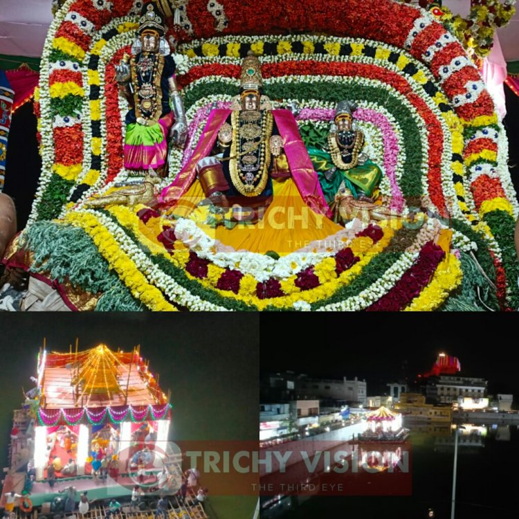 முன்னதாக தாயுமானசுவாமி (சிவபெருமான்) உடனுறை மட்டுவார் குழலம்மை மற்றும் அம்பாளுடன் வாகன மண்டபத்திலிருந்து புறப்பட்டு உள்வீதி, சின்னக்கடைவீதி, என்.எஸ்.பி ரோடு வழியாக வீதி உலா வந்து தெப்ப தீர்த்தக் குளத்தை வந்தடைந்து. அங்கு வண்ணமயமாக மின்விளக்குகளால் அலங்கரிக்கப்பட்டிருந்த தெப்பத்தில் விநாயகர் மற்றும் முருகன் வள்ளி தெய்வாணையுடன் எழுந்தருளி பக்தர்களுக்கு அருள்பாலித்தார்.
