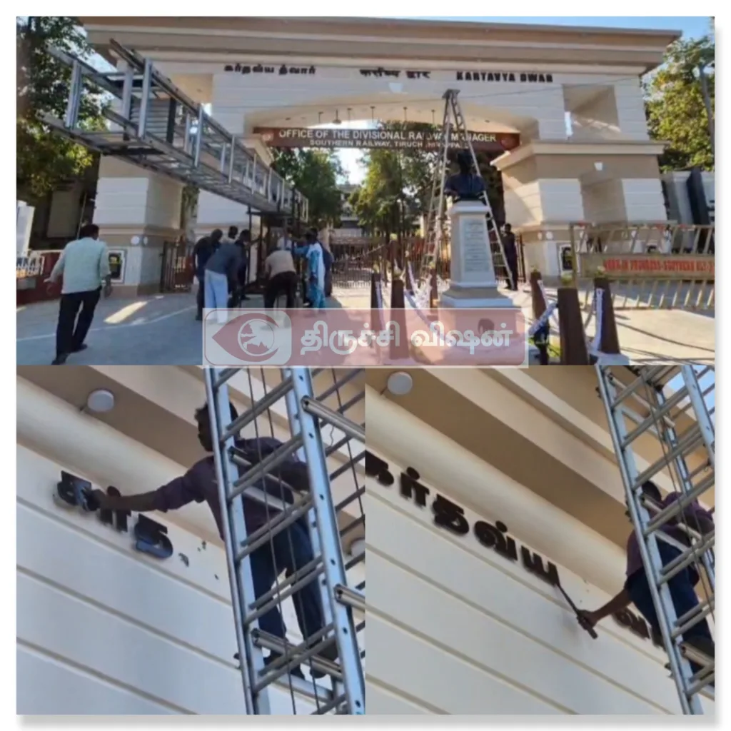 இதன் எதிரொலியாக திருச்சி ரயில்வே கோட்ட மேலாளர் அலுவலக நுழைவாயிலில் பொறிக்கப்பட்டிருந்த