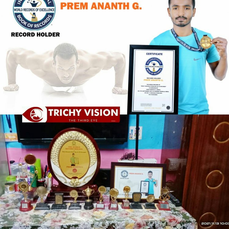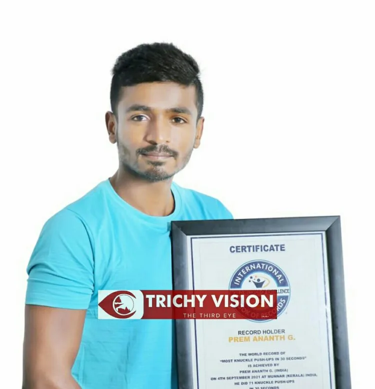 திருச்சியில் கல்லுக்குழி ரயில்வே மைதானத்தில் தடகள விளையாட்டு பயிற்ச்சியாளர்கள் முனியாண்டி மற்றும் சுரேஷ்பாபு அவர்களிடம் விளையாட்டு பயிற்சி பெற்ற தடகள விளையாட்டு வீரர் G.பிரேம் ஆனந்த் கேரளா மாநிலம் கொச்சியில் 30 நொடிகளில் 71 நக்கல் புஷ்அப் சாதனன செய்து International book of world record சாதனை புத்தகத்தில் இடம் பெற்றுள்ளார்.