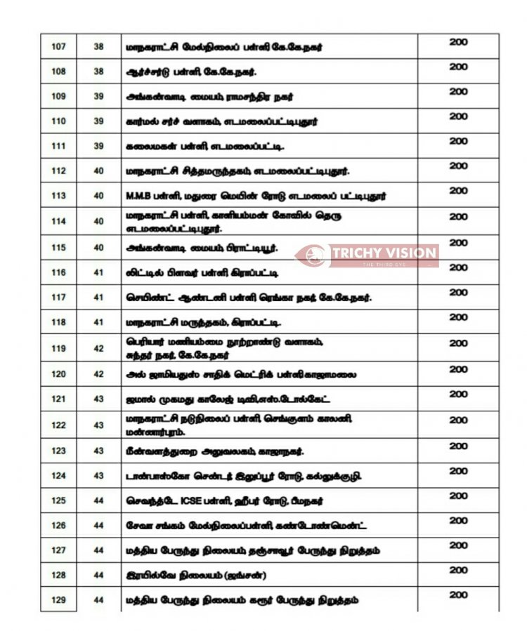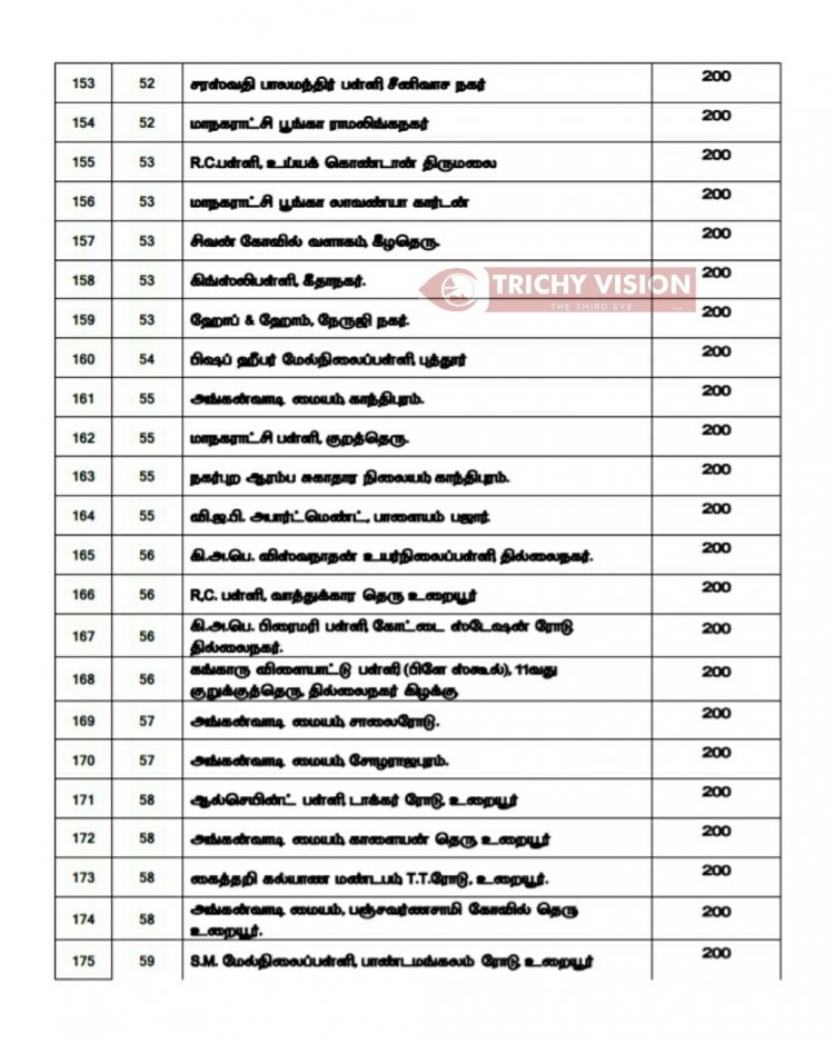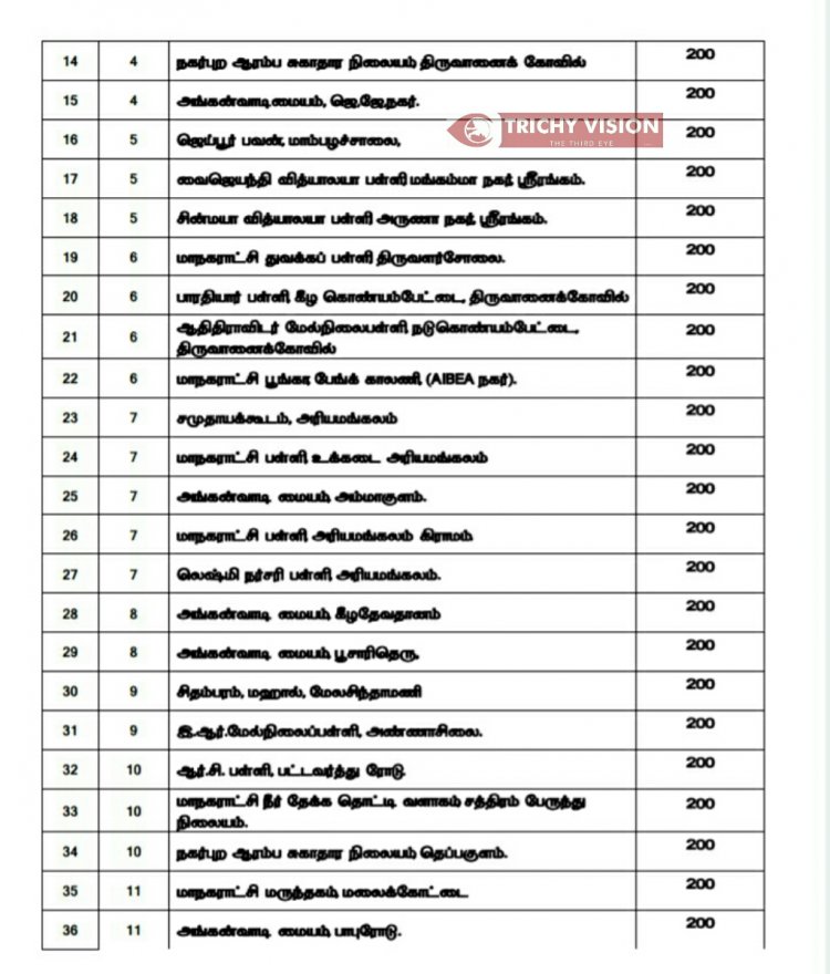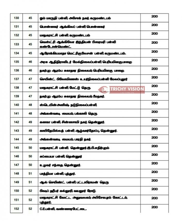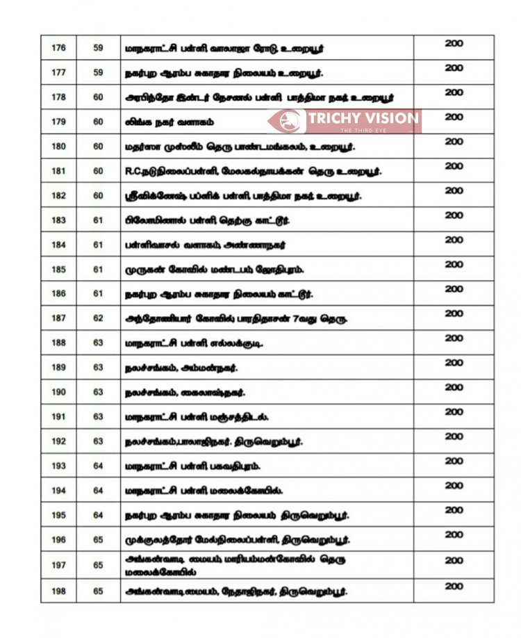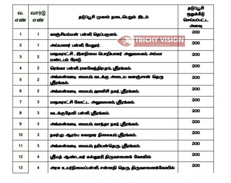திருச்சிராப்பள்ளி மாநகராட்சியில் கொரோனா வைரஸ் தொற்று பரவலைத் தடுக்கும் பொருட்டு 18 வயதிக்கு மேற்பட்டோர் அனைவருக்கும் நாள்தோறும் சிறப்பு முகாம்கள் நடத்தப்பட்டு கொரோனா தடுப்பூசி செலுத்தப்பட்டு வருகிறது. இந்நிலையில் தமிழகமெங்கும் நாளை (03.10.2021) அன்று மாபெரும் கொரோனா தடுப்பூசி முகாம்கள் நடத்திட திட்டமிடப்பட்டுள்ளது. அதனைத் தொடர்ந்து திருச்சிராப்பள்ளி மாநகராட்சியில் கீழ்குறிப்பிட்டுள்ள 198 இடங்களில் (03.10.2021) நாளை காலை 7.00 மணி முதல் மாலை 7.00 மணிவரை மாபெரும் கொரோனா தடுப்பூசி முகாம் நடைபெற உள்ளது.