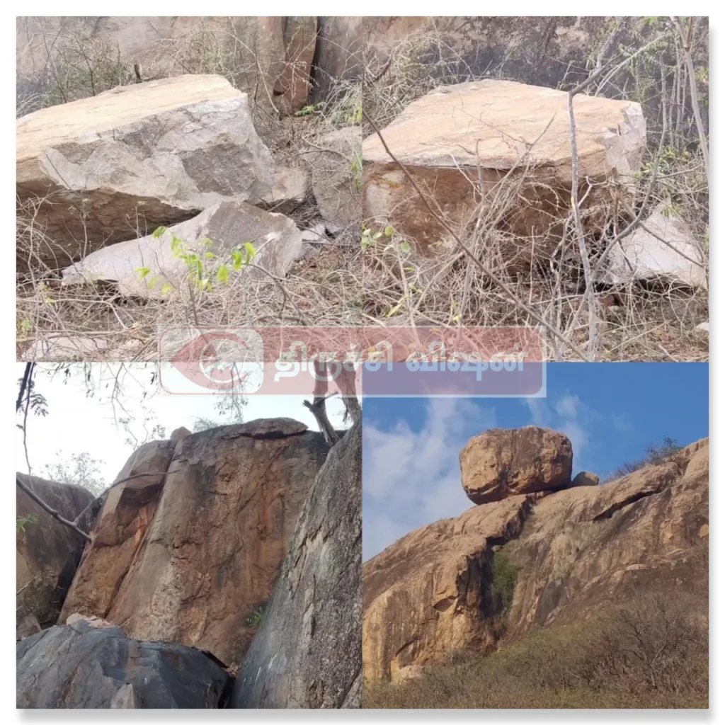 இந்த நிலையில் கடந்த சில தினங்களுக்கு முன்பு மலையின் கிழக்கு புறத்தில் ராட்சத பாறாங்கல் ஒன்று மலை உச்சியில் இருந்து சரிந்து விழுந்தது. இதில் கற்கள் பல துண்டுகளாக சிதறி கிடக்கிறது. அதிலும் ராட்சதக்கல் மலை அடிவாரத்தில் உள்ள மரங்களில் சிக்கி அதற்கு கீழே இறங்காதவாறு தடுக்கப்பட்டுள்ளது.