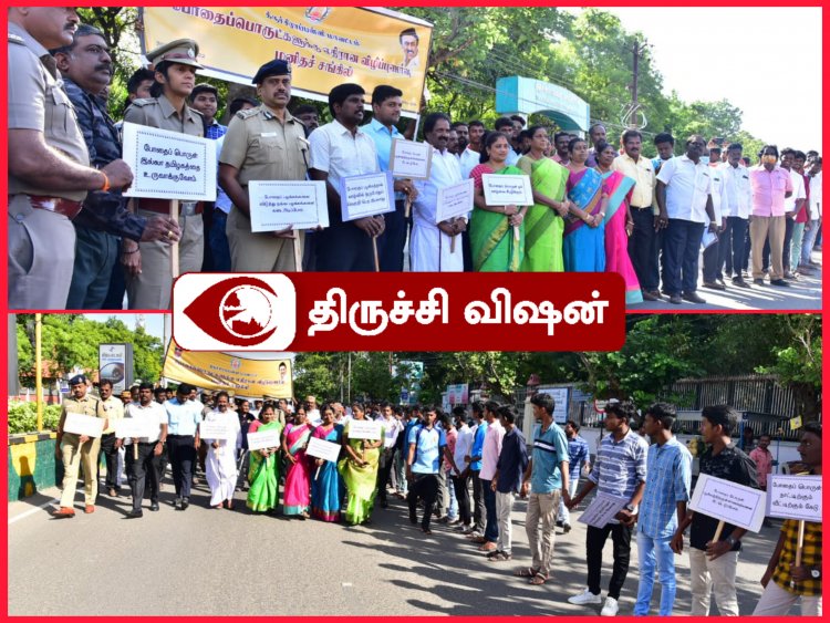 திருச்சிராப்பள்ளி மாநகராட்சி அலுவலக முன்புற சாலையில், ஒன்றரை கிலோ மீட்டர் நீளத்திற்கு போதைப் பொருட்களுக்கு எதிரான விழிப்புணர்வு மனிதச் சங்கிலி மாவட்ட ஆட்சித் தலைவர் மா.பிரதீப் குமார், தலைமையில் இன்று (13.8.22) நடைபெற்றது. இந்நிகழ்ச்சியில் பங்கேற்றவர்கள் போதைப் பொருட்களுக்கு எதிரான பதாகைகளை கையில் ஏந்தியும் , முழக்கங்களை எழுப்பியும் விழிப்புணர்வு ஏற்படுத்தினர்.
