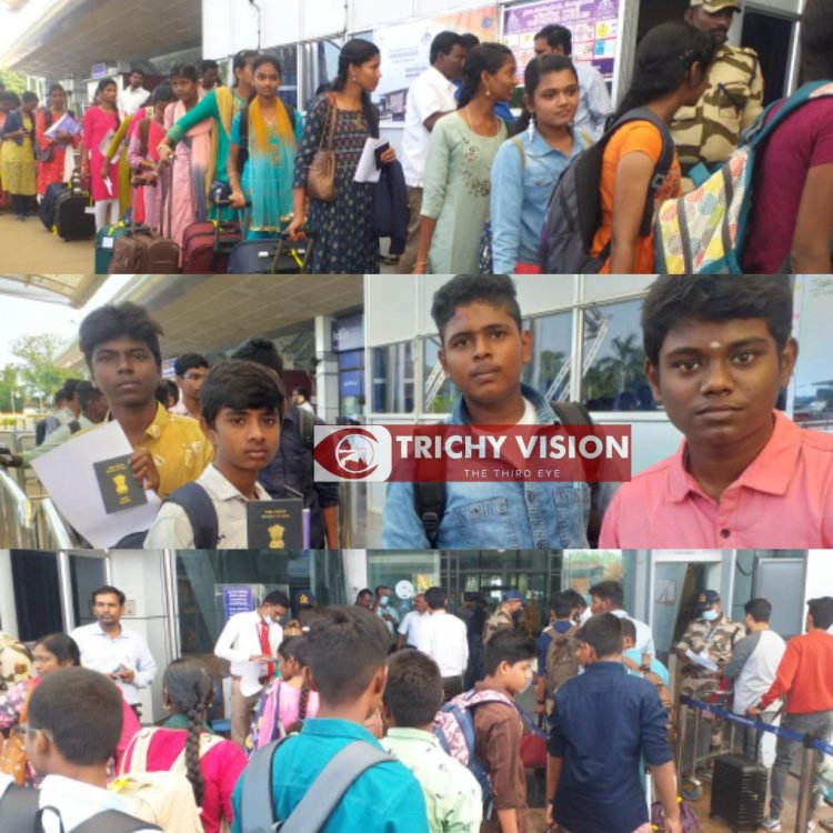 திருச்சி விமான நிலையத்தில் இருந்து ஏர் இந்தியா விமானத்தில்  மாணவ, மாணவிகளுடன் அமைச்சர் மகேஸ் சென்றார். மேலும் மாணவர்களுடன் ஐந்து ஆசிரியர்கள் உட்பட அதிகாரிகள் சென்றுள்ளனர்.