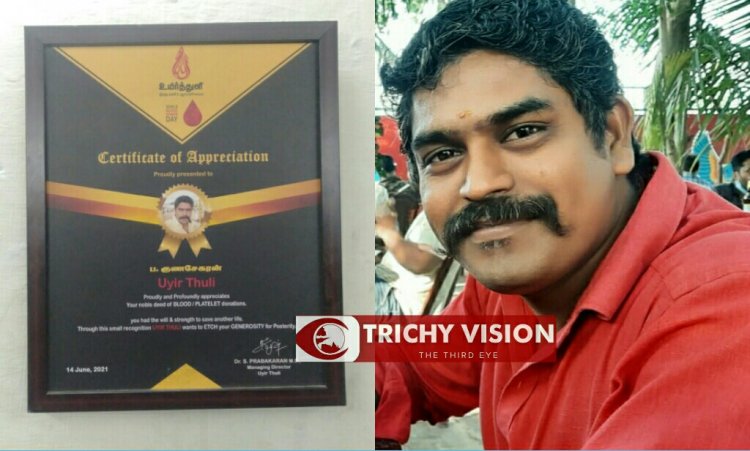 திருச்சி தென்னூர் பகுதியை சேர்ந்தவர் குணசேகரன் நகை பட்டறையில் பணியாற்றி வருகிறார். ஐந்து ஆண்டுகளாக தொடர்ந்து மூன்று மாதத்திற்கு ஒரு முறை ரத்ததானம் வழங்கி வருகிறார். இதுகுறித்து குணசேகரன் கூறுகையில்.. பட்டறையில் பணியை தொடங்கியதிலிருந்து ரத்ததானம் வழங்கி வருகிறேன். எங்கள் பகுதியில் இருக்கும் இளைஞர்களின் ரத்ததானம் செய்ய வேண்டுமென்று ஊக்குவித்து வருகின்றேன்.