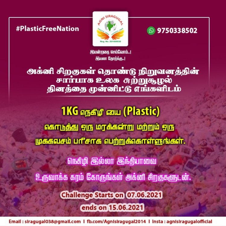 உலக சுற்றுச்சூழல் தினத்தை முன்னிட்டு எங்களிடம் ஒரு கிலோ பிளாஸ்டிக்கை கொடுத்தால் மரக்கன்றுகள் மற்றும் முகக் கவசங்கள் இலவசமாகப் பெற்று செல்லுங்கள் என இவ்வமைப்பினர் தெரிவித்துள்ளனர்.