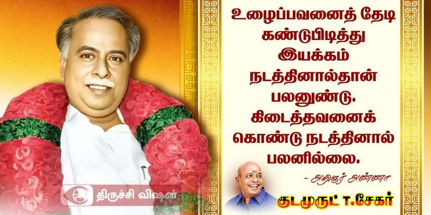இந்நிலையில் பாஜகவில் இருந்து சஸ்பெண்ட் செய்யப்பட்ட திருச்சி சிவா மகன் சூர்யா இரு நாட்கள் முன் மீண்டும் கட்சியில் இணைத்துக் கொள்ளப்பட்டார். அந்நிகழ்வே பரபரப்பாக பேசப்பட்டு வரும் நிலையில், தற்பொழுது திருச்சி முழுவதும் ஒரு அண்ணாவின் போஸ்டர் கண்ணை பறிக்கிறது. அது திமுகவில் டெரராக கருதப்பட்ட முக்கிய பிரமுகர் குடமுருட்டி சேகரால் ஒட்டப்பட்டுள்ளதுடன்,