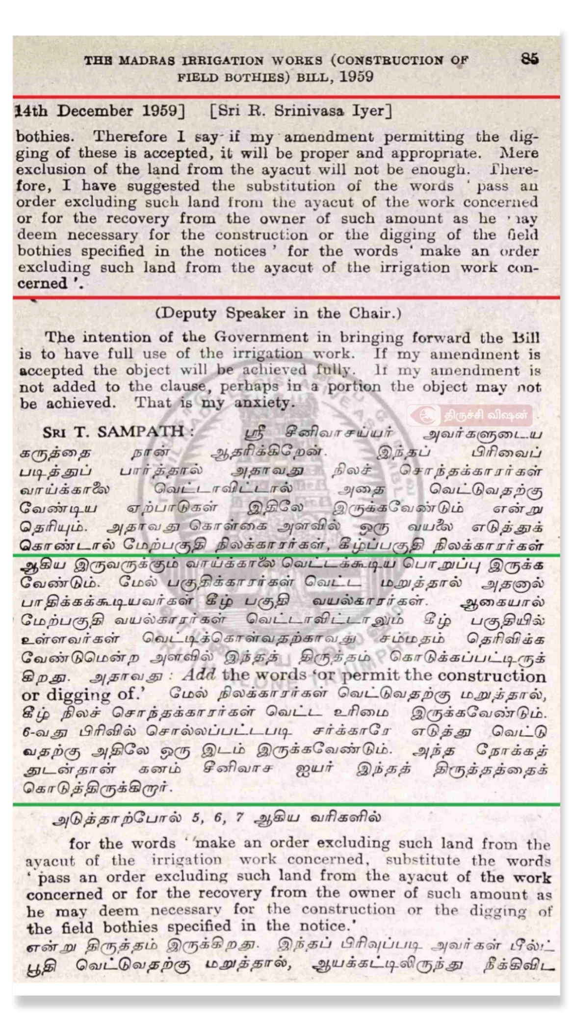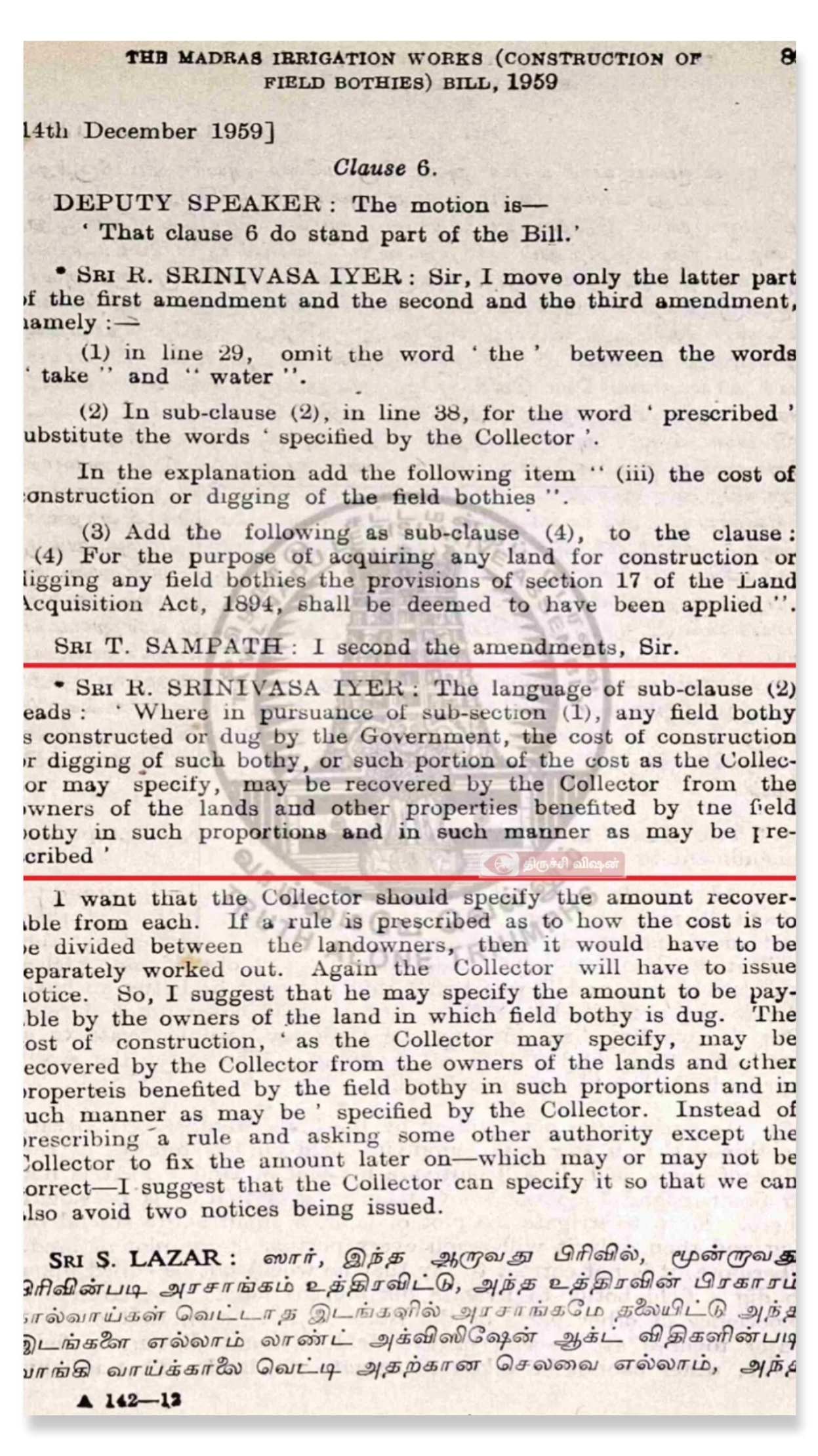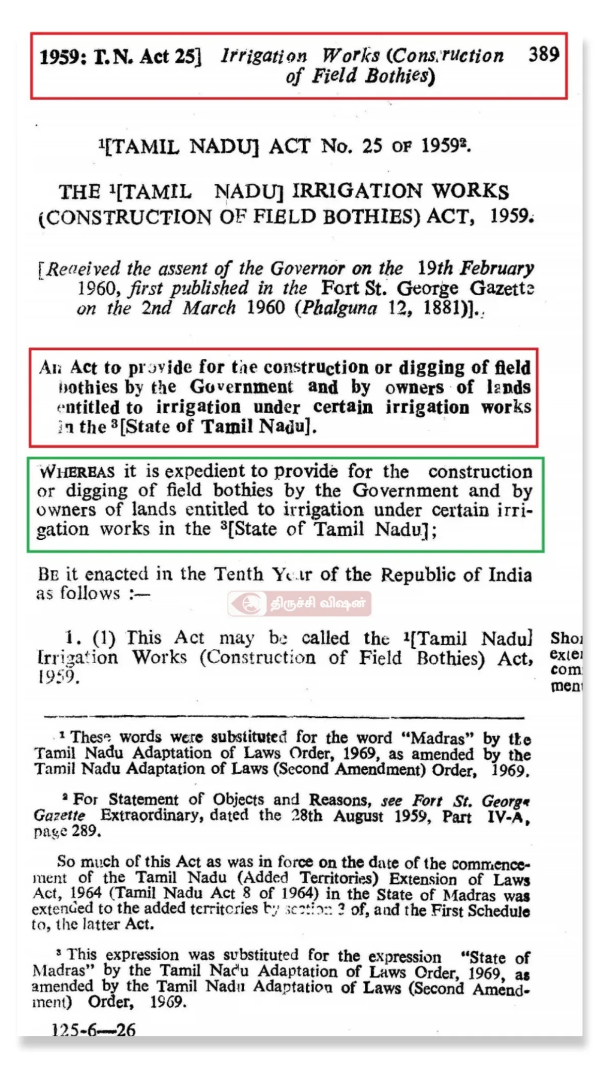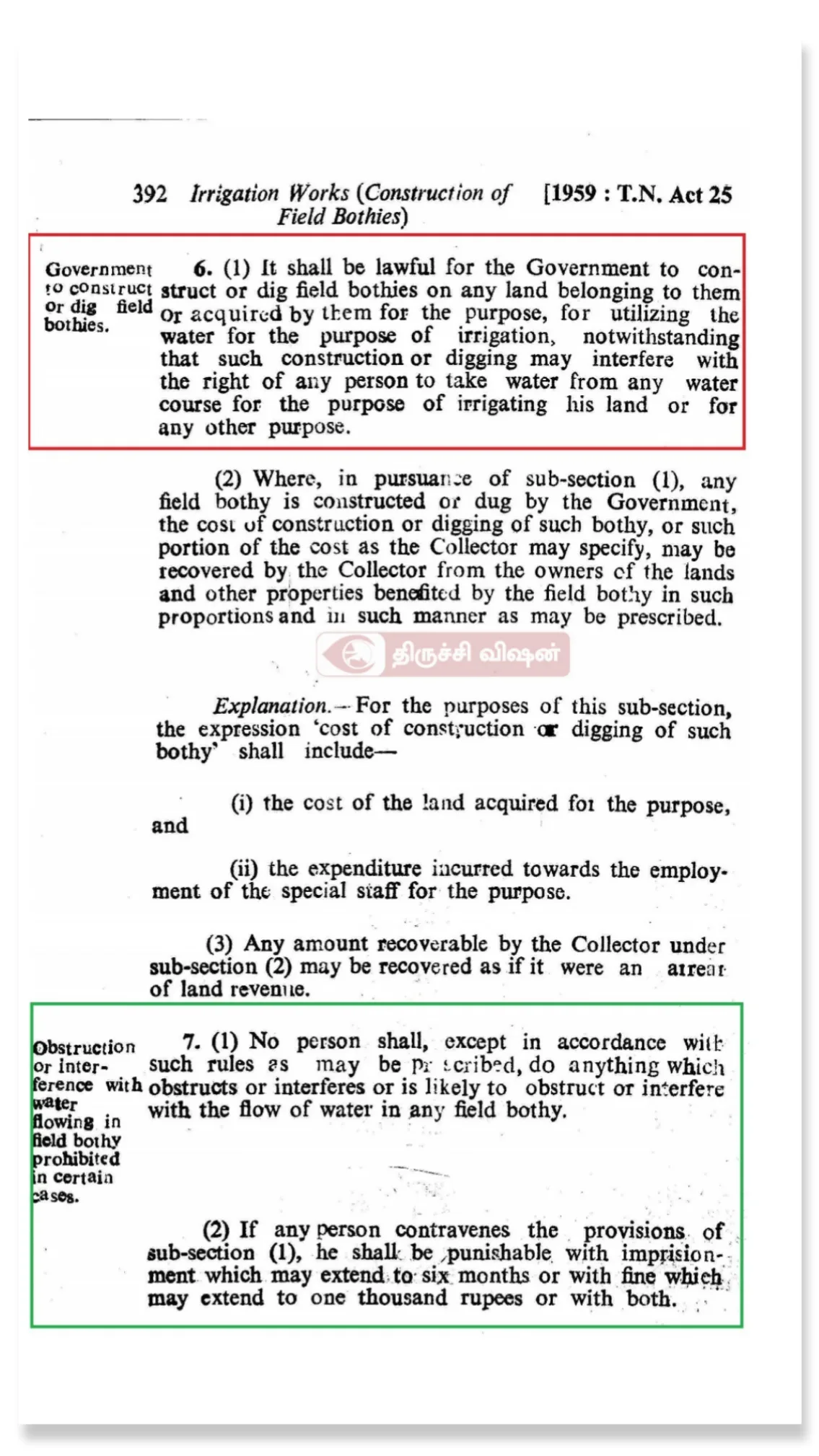 விவசாயம் செய்ய விரும்பும் அனைவருக்கும் தண்ணி கொடுப்பது அரசாங்கத்தின் கடமை என்று சட்டம் இயற்றினார் காமராஜர். தமிழ்நாடு சட்டம் 25 /1959 – “மெட்ராஸ் இரிகேஷன் ஒர்க்ஸ் (பீல்ட் போடீஸ் கட்டுமானம்) மசோதா, 1959”