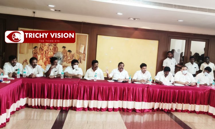 நகர்ப்புற உள்ளாட்சி தேர்தலில் திருச்சி மாநகராட்சியில் 65 வார்டுகள் தேர்தலை சந்திக்க உள்ளது. தனது கூட்டணிக் கட்சிகளுடன் இன்று திருச்சி கலைஞர் அறிவாலயத்தில் கூட்டணி கட்சிகளுக்கான சீட் பங்கீடு தொடர்பாக திமுகவின் முதன்மை செயலாளரும் அமைச்சருமான கே.என்.நேரு, பள்ளிக் கல்வித்துறை அமைச்சர் அன்பில் மகேஸ் மாவட்ட செயலாளர்கள் மற்றும் கூட்டணி கட்சியின் பேச்சுவார்த்தையை தொடர்ந்து நடைபெற்று வந்தது.