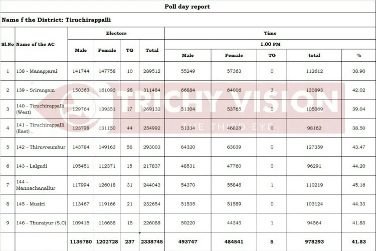 ஒரு மணி நிலவரப்படி திருச்சி மாவட்டத்தில் 9 தொகுதிகளில் 41.83 சதவீத வாக்குகள் பதிவாகியுள்ளது. இதில் மணப்பாறை தொகுதியில் 38.90 சதவீதமும், ஶ்ரீரங்கம் தொகுதியில் 42.02 சதவீதமும், திருச்சி மேற்கு தொகுதியில் 39.04 சதவீதமும், திருச்சி கிழக்கு தொகுதியில் 38.50 சதவீதமும், திருவெறும்பூர் தொகுதியில் 43.47 சதவீதமும், லால்குடி தொகுதியில் 44.20 சதவீதமும், மண்ணச்சநல்லூர் தொகுதியில் 45.16 சதவீதமும், முசிறி தொகுதியில் 44.33 சதவீதமும், துறையூர் தொகுதியில் 41.83 சதவீதமும் பதிவாகியுள்ளது.