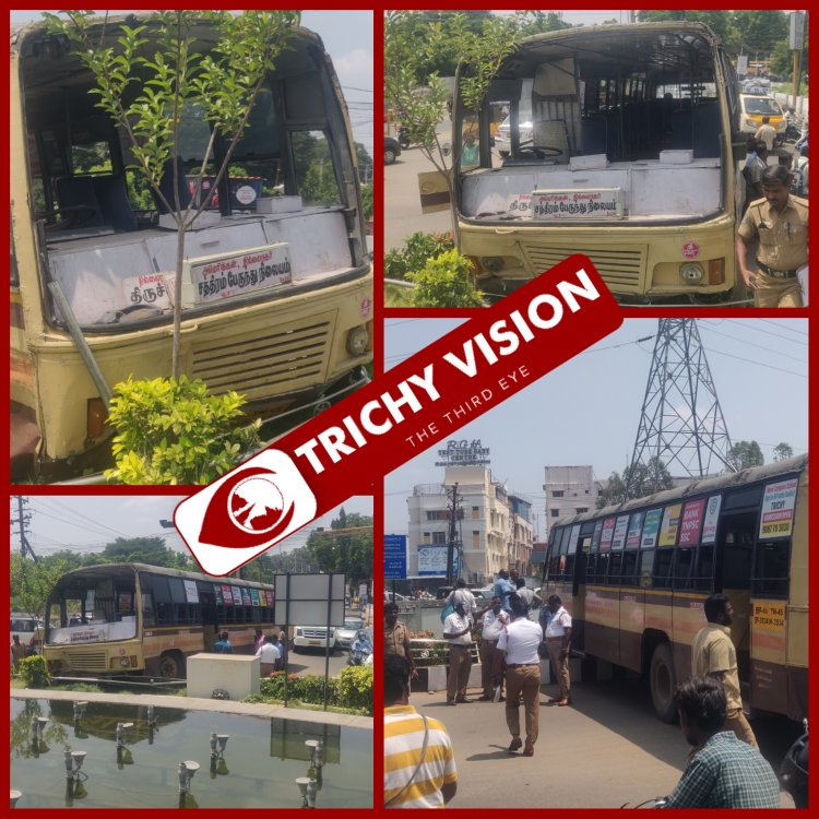 திருச்சி மத்திய பேருந்து நிலையத்திலிருந்து சத்திரம் பேருந்து நிலையம் நோக்கி சென்ற TN 45 N 3534 என்ற அரசு பேருந்து பிரேக் பிடிக்காததால் கட்டுப்பாடு இழந்து எம்ஜிஆர் சிலை கிரவுண்டானாவில் மோதி நின்றது. பதட்டத்தில் பயணிகள் இறங்கி ஓடியும் முன்னே அமர்ந்திருந்த பெண் பயணிகள் ஐந்து பேருக்கு சிறு காயமும் ஏற்பட்டுள்ளது. நீதிமன்றம் அருகே உள்ள எம்ஜிஆர் சிலை பகுதியில் தற்போது போக்குவரத்து நெரிசல் ஏற்பட்டுள்ளது.