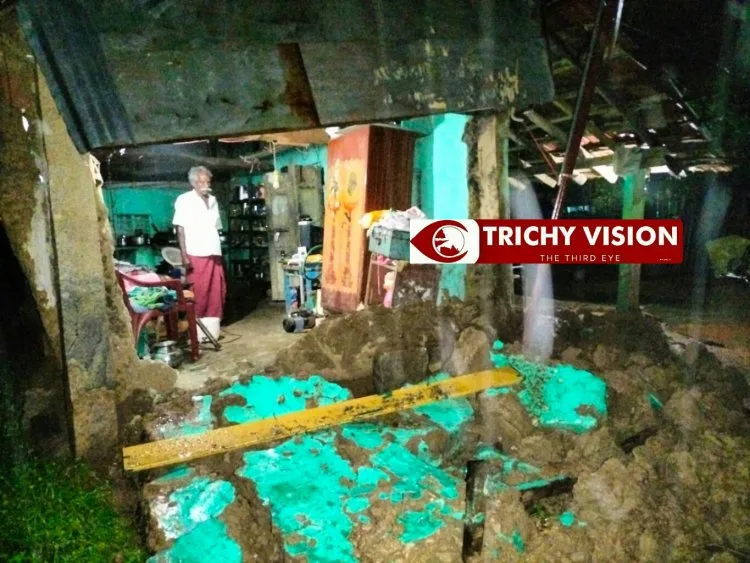 இருந்தபோது எதிர்பாராத விதமாக ஒரு பக்க சுவர் இடிந்து விழுந்துள்ளது. இதில் இருவருக்கும் எந்த காயமும் இல்லை. வீட்டில் இருந்த பொருட்கள் சேதமடைந்தன. இதை அறிந்த அக்கம் பக்கத்தினர் துரைராஜ் மற்றும் மீனம்பாள் பத்திரமாக மீட்டு உறவினர் வீட்டில் தங்க வைத்தனர்.