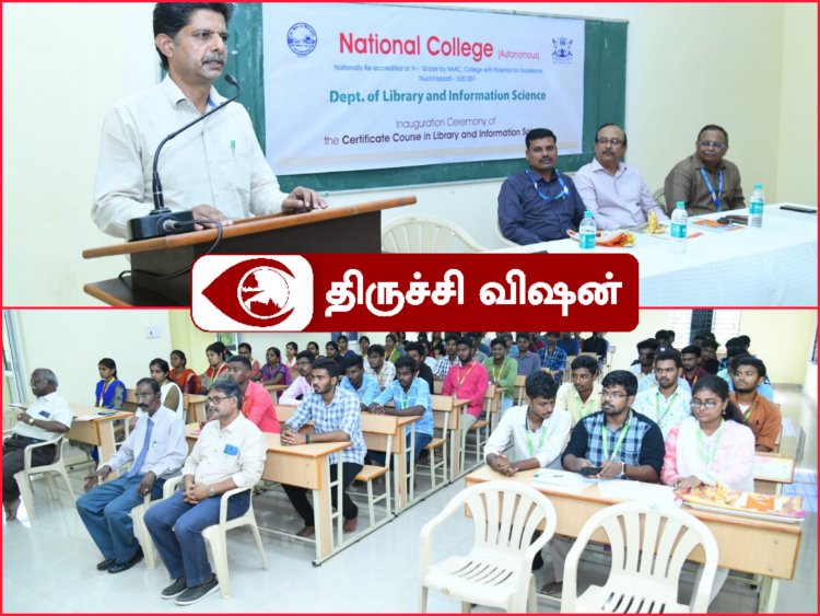 திருச்சி தேசியக் கல்லூரியில் நூலகத் துறை சார்பாக புதிதாக தொடங்கப்பட்ட சான்றிதழ் படிப்பிற்கான தொடக்கவிழா இன்று மதியம் இரண்டரை மணி அளவில் கல்லூரி நூலகத்தில் அமைந்துள்ள ஒலி-ஒளி அரங்கில் சிறப்பாக நடைபெற்றது.விழாவிற்கு கல்லூரி செயலாளர் ரகுநாதன் முன்னிலை வகித்தார் முதல்வர் குமார் தலைமை தாங்கினார்.