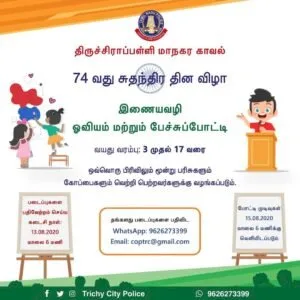 74 வது சுதந்திர தின விழாவை முன்னிட்டு திருச்சி மாநகர காவல்துறை சார்பில் குழந்தைகளுக்கு இணையவழி போட்டிகளை அறிவித்துள்ளனர்.