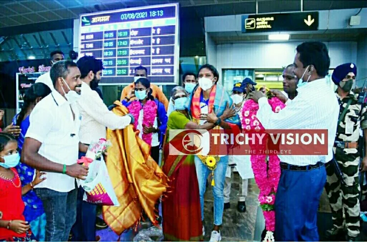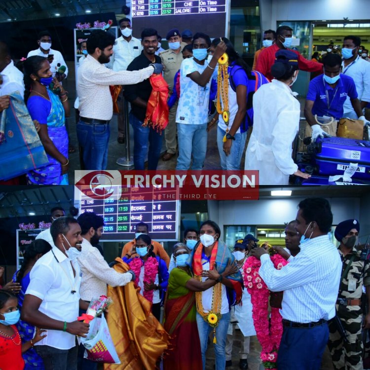 டோக்கியோவில் நடைபெற்று வரும் ஒலிம்பிக் போட்டியில் 400 மீட்டர் கலப்பு தொடர் ஓட்டதில் கலந்து கொண்ட திருச்சியை சேர்ந்த சுபா மற்றும் தனலட்சுமி விமானம் மூலம் திருச்சி வந்தனர். இவர்களுக்கு விமான நிலையத்தில் உற்சாக வரவேற்பு அளிக்கப்பட்டது.