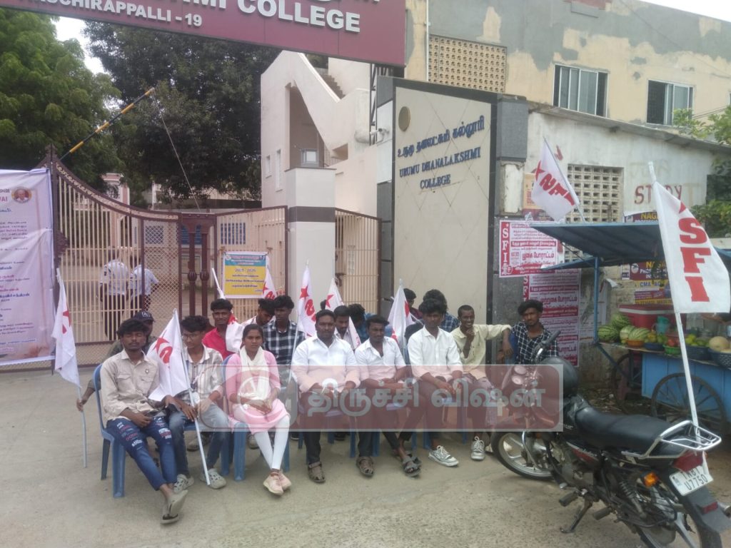 இதே கோரிக்கையை வலியுறுத்தி துவாக்குடி அருகில் உள்ள அரசு கலைக் கல்லூரியில் இந்திய மாணவர் சங்க மாணவர்கள் கல்லூரி வாயில் முன் ஆர்ப்பாட்டத்தில் ஈடுபட்டனர்