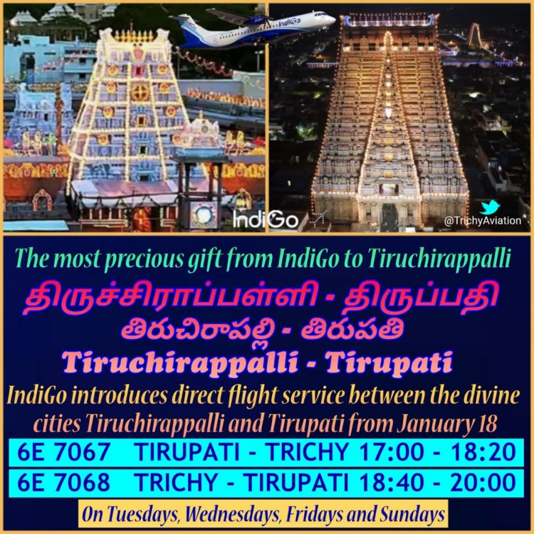 இதேபோன்று திருப்பதியில் இருந்து மாலை 5 மணிக்கு புறப்பட்டு மாலை 6.20 மணிக்கு திருச்சி விமான நிலையம் வந்தடையும்.