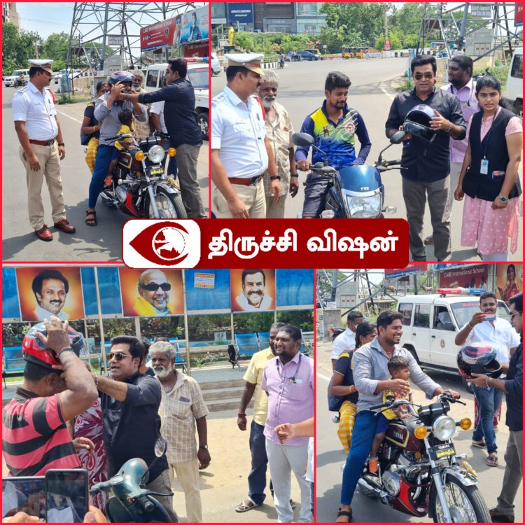 திருச்சியில் இரு சக்கர வாகனங்களில் செல்பவர்கள் கட்டாயமாக தலைக்கவசம் அணிந்து கொள்ள வேண்டும் என்பதை வலியுறுத்தி திருச்சியை சேர்ந்த கராத்தே முத்துக்குமார் என்பவர் வாகன ஓட்டிகளுக்கு தலைக்கவசம் வழங்கி விழிப்புணர்வு ஏற்படுத்தி உள்ளார்.
