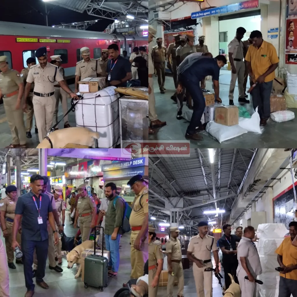 திருச்சி ரயில் நிலைய வளாகம் முழுவதும், ரயில் பெட்டிகள் மற்றும் காத்திருப்புப் பகுதிகளில் தீவிர சோதனை நடத்தப்பட்டது.