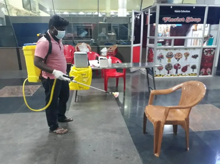 மேலும் தடுப்பு கம்பிகள், பின்னால் பயணிகளை அழைத்து வருபவர்கள் அமரும் இருக்கைகள் மற்றும் தரைப்பகுதியில் கிருமிநாசினி கொண்டு சுகாதார துறையினர் சுத்தம் செய்து வருகின்றனர். மேலும், விமானத்தில் பயணித்த பயணிகளை உடல் வெப்பம் மற்றும் கொரோனா தொற்று பரிசோதனை செய்யப்படுகிறது.