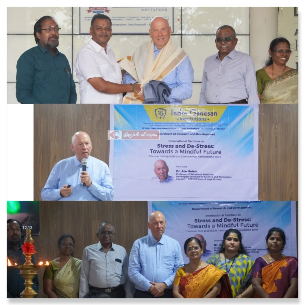 இந்திரா கணேசன் கல்விக் குழுமத்தின் ஆராய்ச்சி மற்றும் மேம்பாட்டு துறை சார்பில் “மன அழுத்தமும் மன அமைதியும்: விழிப்புணர்வான எதிர்காலத்திற்கான பயணம்” என்ற தலைப்பில் சர்வதேச கருத்தரங்கம் 07.10.2025 அன்று நடத்தப்பட்டது. இந்நிகழ்வின் நோக்கம், இன்றைய வேகமான வாழ்க்கை முறைமையில் மன நலன் மற்றும் மனச்சாந்தி பற்றிய விழிப்புணர்வை ஏற்படுத்துவதாகும்.