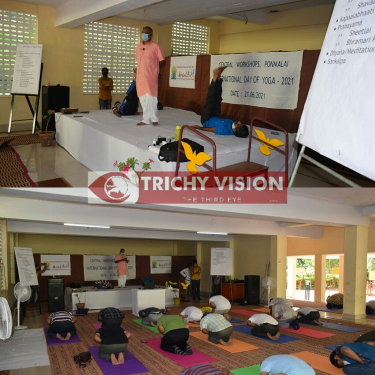 சர்வதேச யோகா தினத்தை முன்னிட்டு நேற்று திருச்சி பொன்மலை பணிமணையில் அமைந்துள்ள பயிற்சி மையத்தின் மண்டபத்தில் சிறப்பு யோகா பயிற்சி நடைபெற்றது. தி ஆர்ட் ஆஃப் லிவிங்கைச் சேர்ந்த அனுபவமிக்க யோகா பயிற்றுனர் ஏ.செல்வம் வழிகாட்டலின் படி “உடல் நலம் மன நலம் தேச நலன் மற்றும் பணியிட சூழல் ஆகியவற்றில் கவனம் செலுத்தி மேம்பாடு அடைதல்” என்ற கருப்பொருளோடு நடைபெற்ற பயிற்சியில் 50 அதிகாரிகள் மற்றும் மேற்பார்வையாளர்கள் பங்கேற்று பயன் பெற்றனர்.