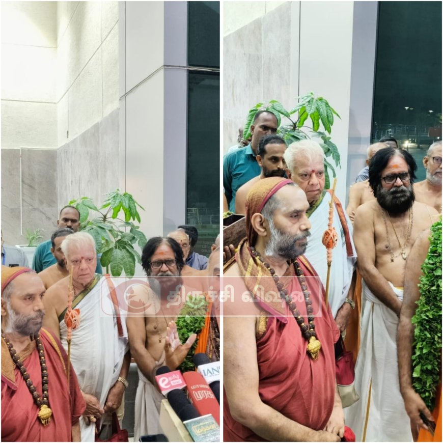 உத்தரபிரதேசம் மாநிலத்தில் நடந்து வரும் கும்பமேளாவில் கலந்துகொண்டு நேற்று(23.02.2025) இரவு திருச்சி வந்த காஞ்சி ஸ்ரீசங்கர விஜயேந்திர சரஸ்வதி சுவாமிகள் விமான நிலையத்தில் நிருபர்களுக்கு பேட்டியளித்தார். அருகில் சகடபுரம் கிருஷ்ணாநந்த தீர்த்தர்.உத்தரப்பிரதேச மாநிலம் பிரயாக்ராஜ் திரிவேணி சங்கமத் தில் நடந்து வரும் கும்பமேளா வில் கலந்து கொண்டு காஞ்சி காமகோடி பீடாதிபதி ஸ்ரீசங்கர விஜயேந்திர சரஸ்வதி சுவாமி கள் தனி விமானம் மூலம் திருச்சி விமான நிலையத்துக்கு நேற்றிரவு திரும்பினார்.