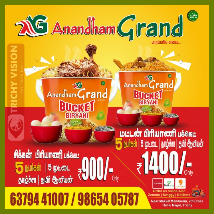 திருச்சி தில்லைநகர் ஆனந்தம் கிராண்டில் பிரியாணி மேளா துவங்கியுள்ளது . அசைவப் பிரியர்களுக்கு அறுசுவை படைக்க ஆனந்தம் ரெஸ்டாரன்ட் பக்கெட் பிரியாணிகளை அறிமுகம் செய்துள்ளது. பிரியாணி என்றாலே அனைவருக்கும் ருசிக்க தோன்றும். அந்த வகையில் சிக்கன் மற்றும் மட்டன் பிரியாணி வகைகள் பக்கெட்டுகளாக விற்பனைக்கு அறிமுகப்படுத்தப்பட்டுள்ளது.