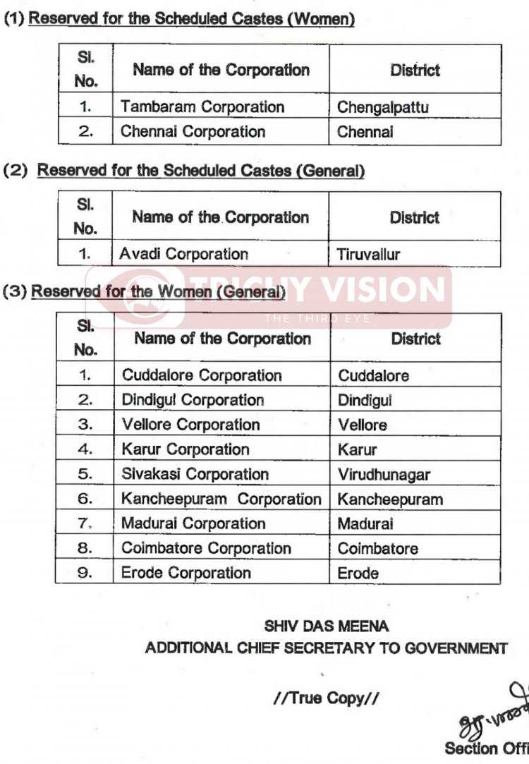 சென்னை, ஆவடி, தாம்பரம் ஆகிய மாநகராட்சி மேயர் பதவிகள் எஸ்.சிக்கு ஒதுக்கீடு செய்யப்பட்டு உள்ளன. இதில், சென்னை, தாம்பரம் மாநகராட்சிகள் எஸ்.சி பெண்களுக்கும், ஆவடி மாநகராட்சி எஸ்.சி (பொது) பிரிவுக்கும் ஒதுக்கீடு செய்யப்பட்டு உள்ளது.