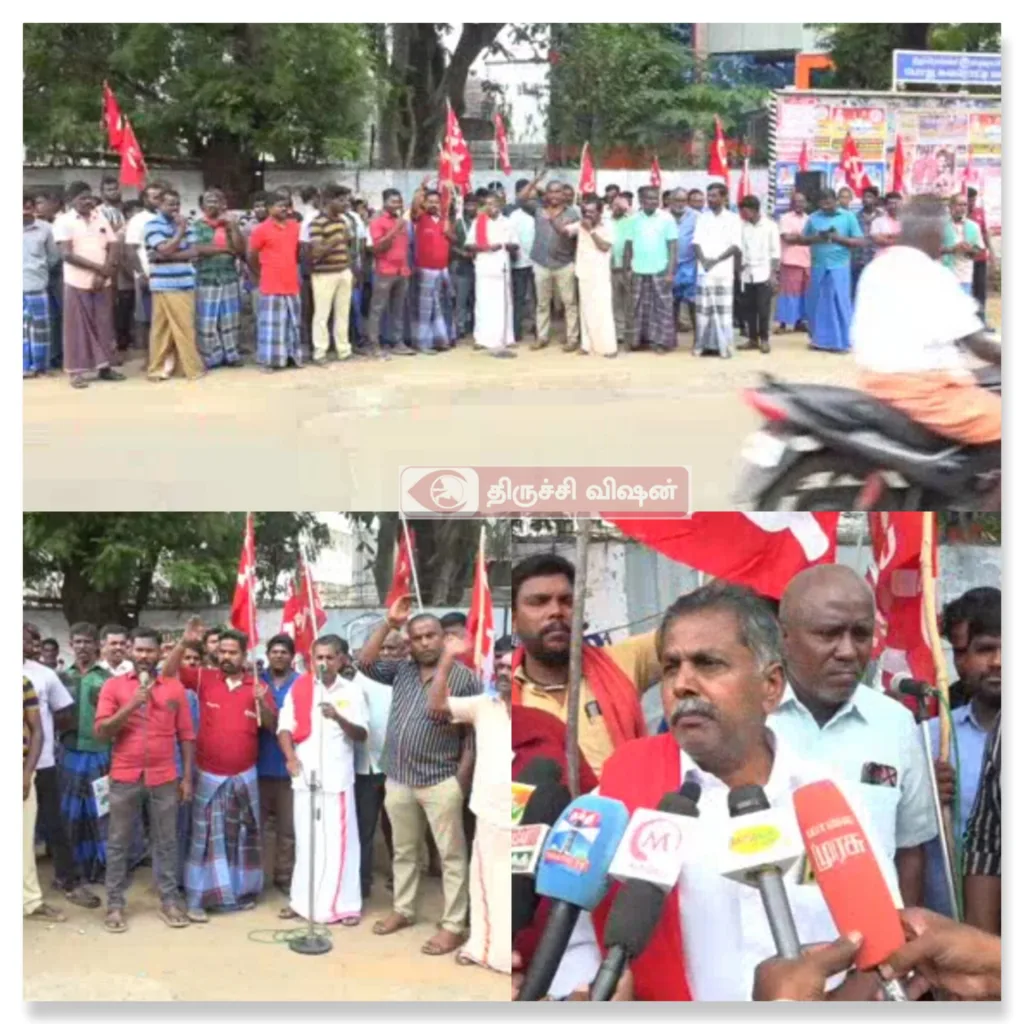 திருச்சி காந்தி மார்க்கெட்டில் சுமார் 350 சுமைப்பணி தொழிலாளர்கள் 25 ஆண்டுகளாக வேலைசெய்துவருகின்றனர், இறக்கும் பொருட்களுக்கு ஏற்றவாறு கூலி என்ற நடைமுறையில் பணியாற்றிவரும் 12 சுமைத்தூக்கும் தொழிலாளர்களை சேகர் பிரதர்ஸ் என்ற லாரி செட் உரிமையாளர்கள் பணிநீக்கம் செய்து 70நாட்கள் ஆகியும், தொழிலாளர் நலத்துறை அவர்களுக்கு பணிவழங்க உத்தரவிட்டும் பணிவழங்காததை கண்டித்தும் தொழிலாளர் நலத்துறை உத்தரவை செயல்படுத்தாத காந்திமார்க்கெட் காவல்துறையை கண்டித்தும் சிஐடியு சுமைப்பணி தொழிலாளர் சங்கம் சார்பில் மாவட்ட தலைவர் ராமர் தலைமையில், திருச்சி மாவட்ட ஆட்சியர் அலுவலகம் அருகில் கண்டன போராட்டம் நடைபெற்றது.நூற்றுக்கும் மேற்பட்ட சுமைப்பணி தொழிலாளர்கள் பங்கேற்று தொழிலாளர்களை வஞ்சிப்பதை கண்டித்து கண்டன முழக்கங்கள் எழுப்பினார்கள்.