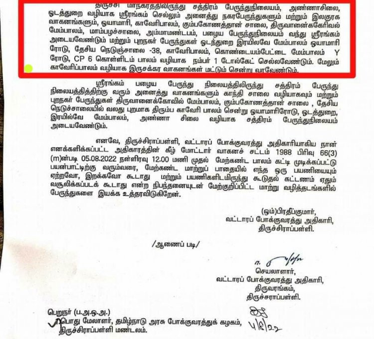 பராமரிப்பு பணிகள் நடைபெறும்போது வாகனப் போக்குவரத்து நெரிசலை தவிர்க்க காவிரி பாலம் இன்று இரவு 12.00 (05.08.2022 ) முதல் மூடப்படுகிறது