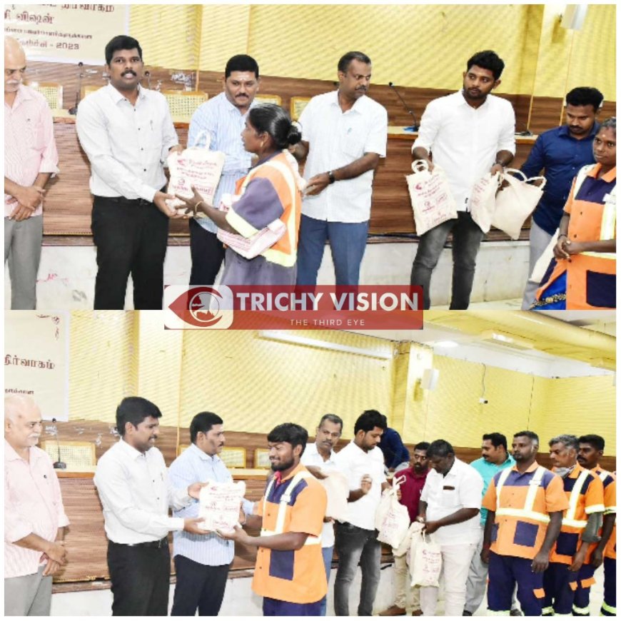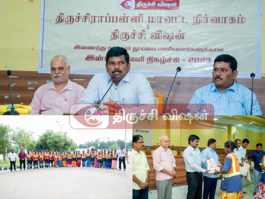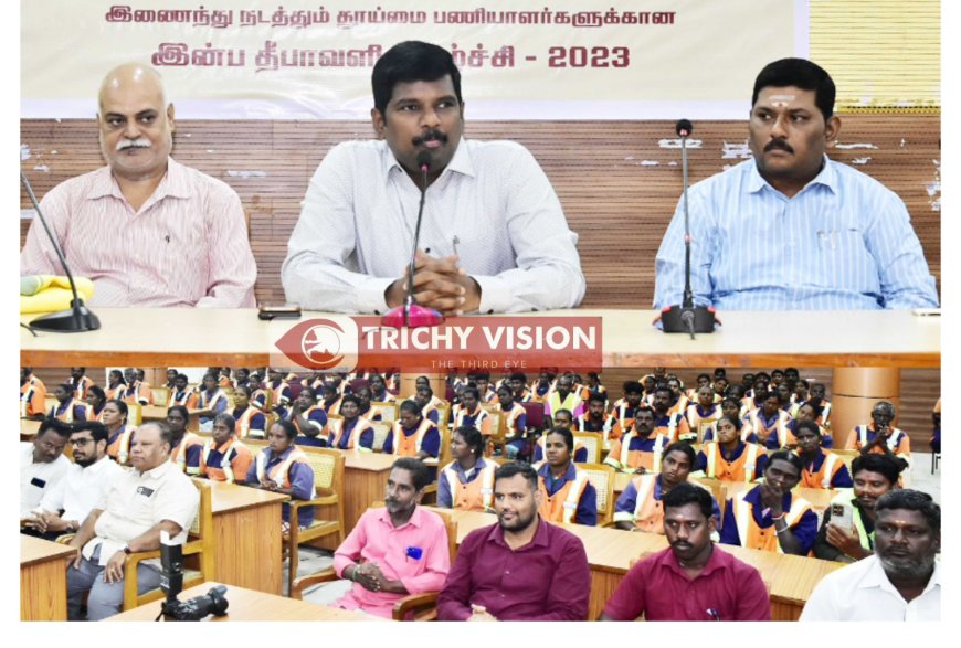 திருச்சி விஷன் அறக்கட்டளை சார்பில் மாவட்ட நிர்வாகத்துடன் இணைந்து தூய்மை பணியாளர்களுக்கு தீபாவளி பரிசு வழங்கும் விழா மாவட்ட ஆட்சியரகத்தில் நடைபெற்றது. இந்நிகழ்ச்சிக்கு சிறப்பு விருந்தினராக திருச்சி மாவட்ட ஆட்சியர் பிரதீப் குமார் கலந்து கொண்டார்.