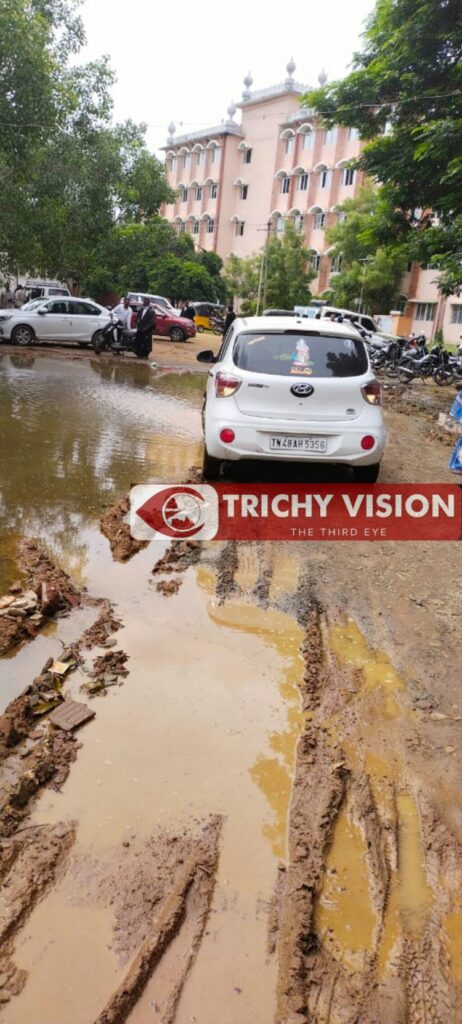 தற்போது நாளொன்றுக்கு ஆயிரக்கணக்கான வழக்குகளை சந்திக்கும் திருச்சி மாவட்ட நீதிமன்ற வளாகத்தில் மழை நீர் தேங்கி நீதிபதிகள், வழக்கறிஞர்கள், பொதுமக்கள் நீதிமன்றத்திற்குள் செல்வதற்கே பெரும் சிரமப்படுகின்றனர். மேலும் சாலைகள் முறையாக நீதிமன்ற வளாகத்திற்குள் போடப்படவில்லை. தற்போது ஆங்காங்கே மழை நீர் 10 நாட்களுக்கும் மேலாக தேங்கி உள்ளது. சேறும் சகதியுமாக உள்ள பகுதியை நான்கு சக்கர வாகனங்கள், இருசக்கர வாகனம் கடக்கும் பொழுது சிக்கிக் கொள்கின்றன.