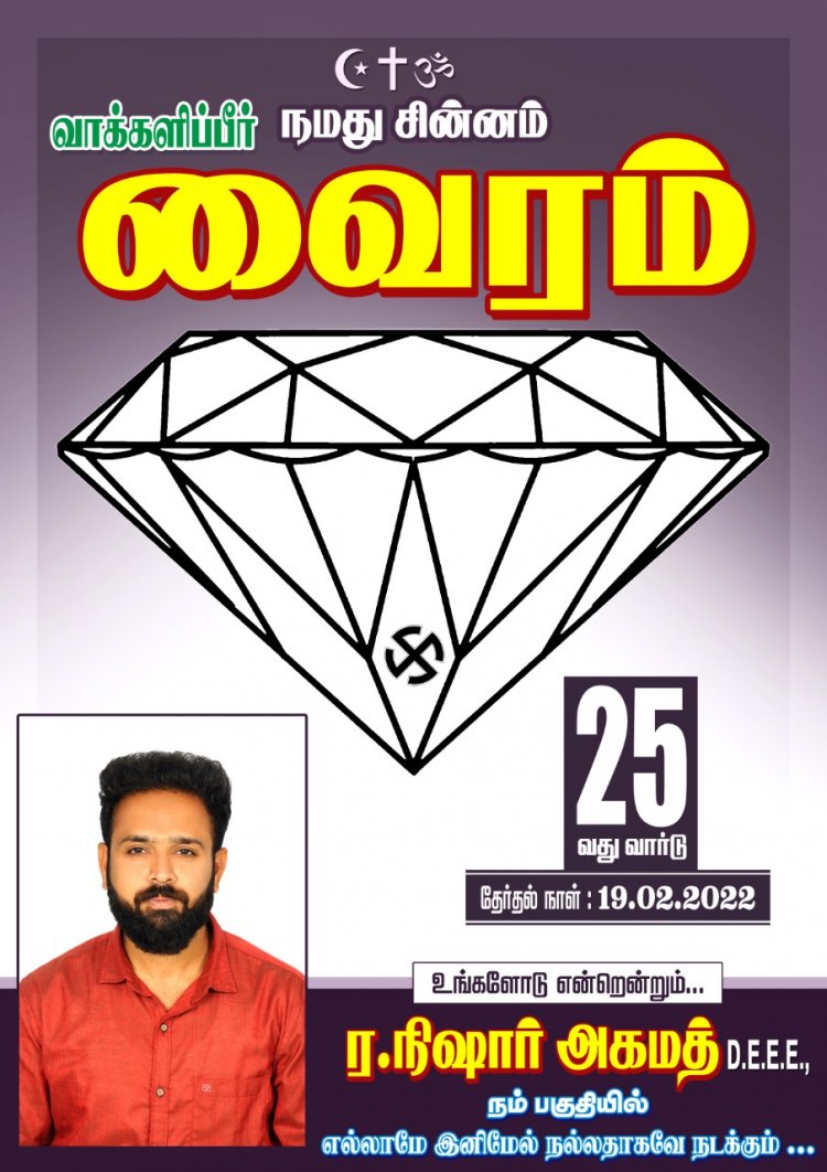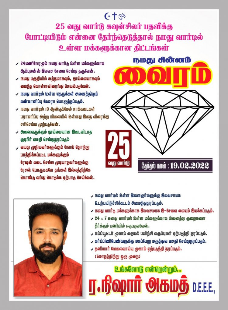 வருகின்ற பிப்ரவரி 19ஆம் தேதி நடைபெற இருக்கின்ற நகர்ப்புற  உள்ளாட்சி தேர்தலில் 25வது வார்டில் கவுன்சிலர் பதவிக்குசுயேட்சையாக வைரம் சின்னத்தில்  போட்டியிடும் நிஷார் அகமத்த   அறிவித்துள்ள   தேர்தல் வாக்குறுதிகள்   அப்பகுதி மக்கள் மத்தியில் பெரும் வரவேற்பை பெற்றுள்ளது.